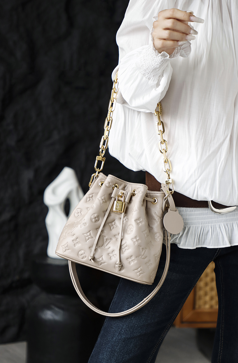 In off-white, it instantly looks gentle and versatile, giving a softening filter effect. The detachable chain lets you switch carrying styles freely: tucked under the arm for a sweet-but-edgy vibe, worn crossbody for a girl-next-door big-sister look—style changes as you please!